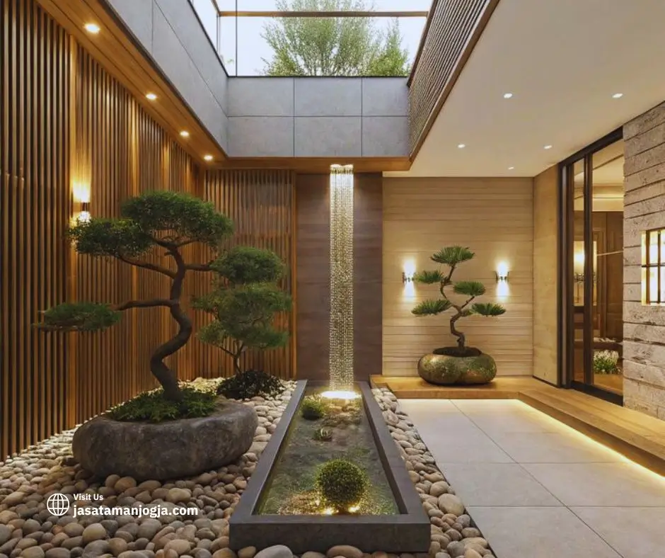 Jangan lupa, suasana Zen Garden bisa semakin dramatis dengan pencahayaan yang tepat. Anda bisa menambahkan lampu sorot kecil di sekitar air mancur untuk memberikan efek cahaya lembut saat malam hari.
