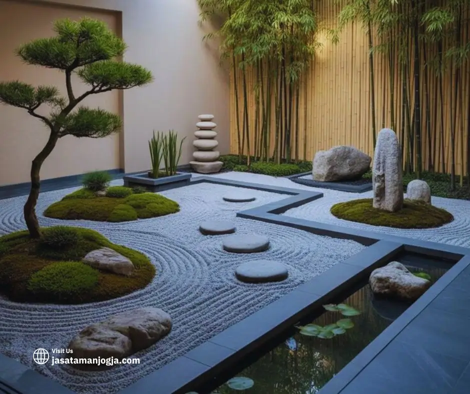 Tips tambahan: gunakan material batu alam atau beton ekspos agar lebih menyatu dengan elemen pasir dan kerikil khas Zen Garden.